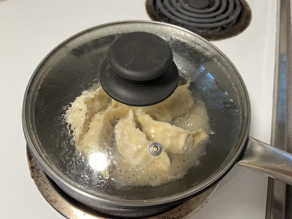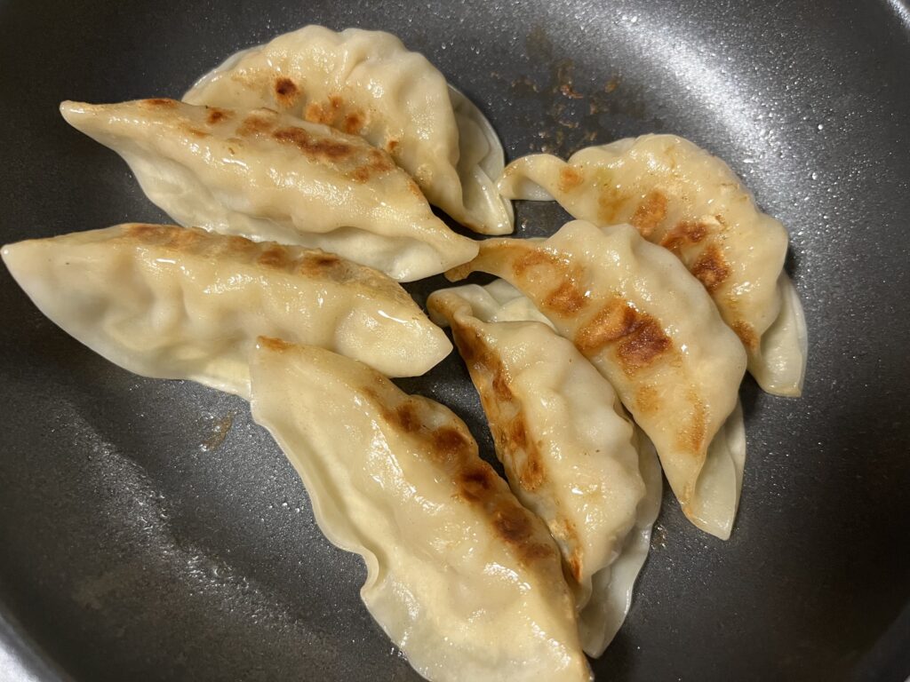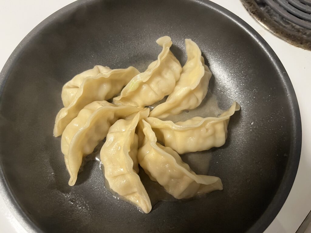 まずはフライパンに油をひき、餃子を乗せて中火で焼きます。焼き目が付いたらお水を少し入れて、蓋を閉める。水分がなくなるまで蒸します!